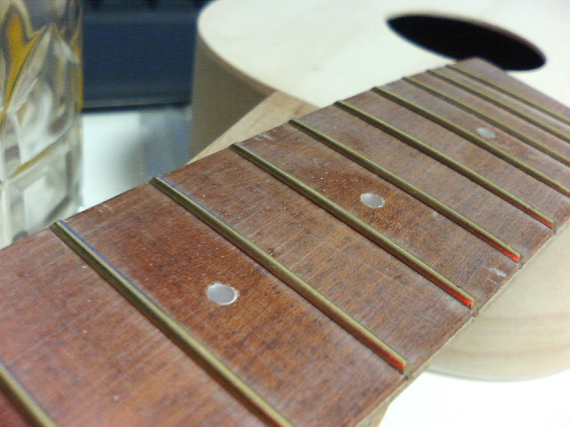 指板にポジションマーク用の穴があいており、インレイ?らしいものも付属していました。穴を少し加工(3mmくらいかな?)して接着。飛び出した部分は削り取りました。まあまあかな?