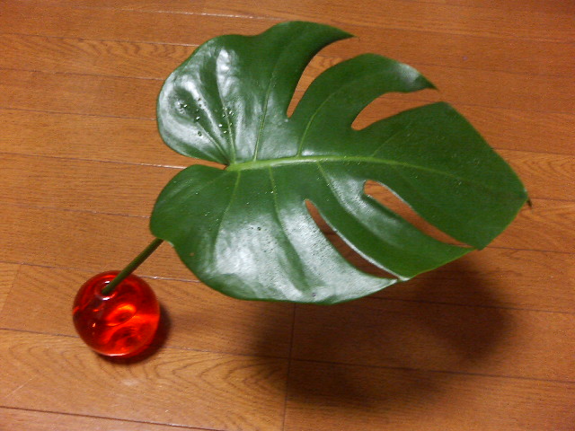 おまけですが、モンステラの葉、買いました。だって欲しかったんだもん。沖縄で買った一輪挿しに入れてみました。う~んいい感じ(゚∀゚)