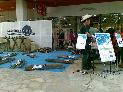 途中ecoマリワークショップのイベントの一環で椎茸のホダ打ち体験を子供と一緒にした。(無料だよ)