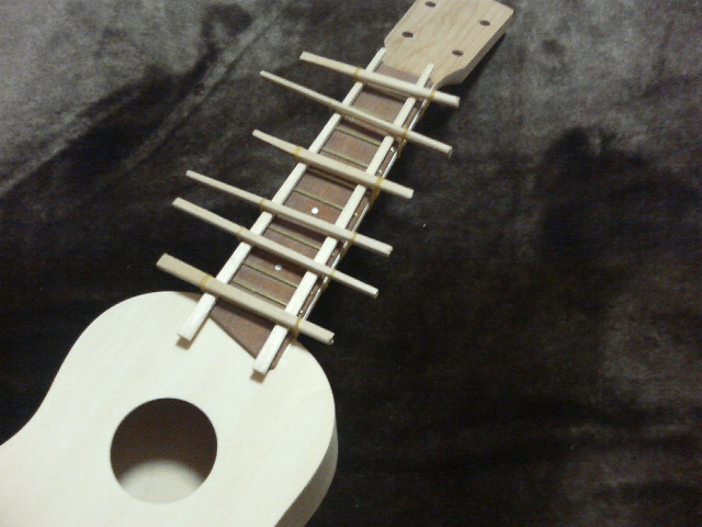 さて指板をネックに接着です。指板は反り返っていましたので割り箸と輪ゴムでしっかりおさえます。