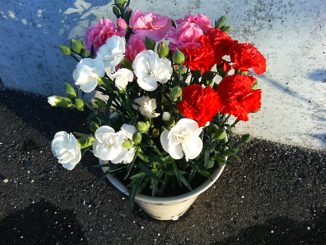 ついでにカーネーションの3色植えも決行しました。母の日シーズンになると高くて買えませんから金額の安い今のうちに・・・。