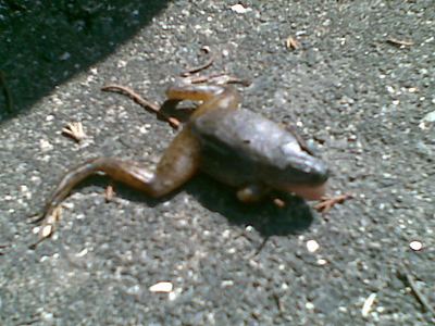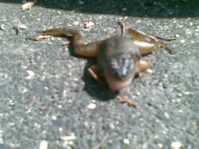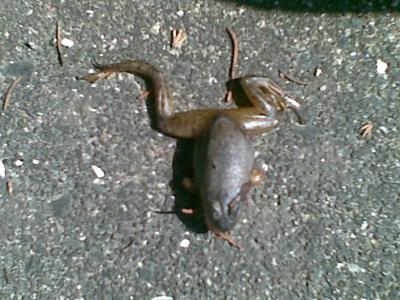 先ほど昼飯後に散歩していたのですが、蛙が干からびていました。