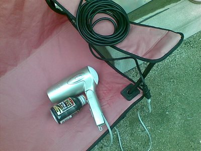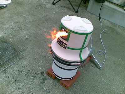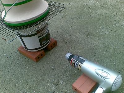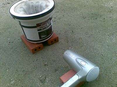 1は延長コードを買ってきて外のコンセントに繋ぎ、いらなくなったらしいドライヤを使う。コーヒーの缶は七輪の戸口にピンポイントで送風するための道具。一応HOT用。