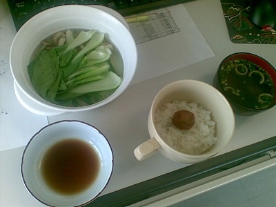 サラリーマンの昼飯なのに、ほとんど電子レンジで料理してるのがなんだか変です。弁当もってくりゃいいのによ。でも出来立てのご飯とかパスタ・ラーメンもうまいし新鮮野菜を食べるのもGOOD。弁当って揚げ物とかがおおいもんねぇ。ダイエットもしないとなぁ。